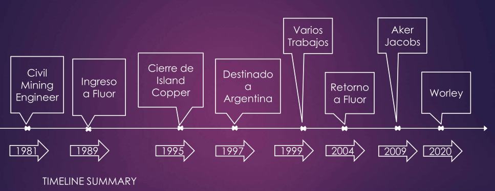 En 1989 ingresé a Fluor Daniel Chile y en 1996 fuí destinado a Buenos Aires como ingeniero líder de procesos para el Proyecto Cerro Vanguardia. En 1997 mi destinación fué en la patagonia argentina para el precomisionamiento, comisionamiento y puesta en marcha del proyecto Cerro Vanguardia. El gerente de procesos de la PEM fué Andrea Festa, y junto a un equipo de ingenieros canadienses, brasileños, chilenos y argentinos dejamos la planta operando a capacidad luego de 9 meses. Este lapso de tiempo incluyó operar la planta durante varios meses para entrenamiento del personal argentino.